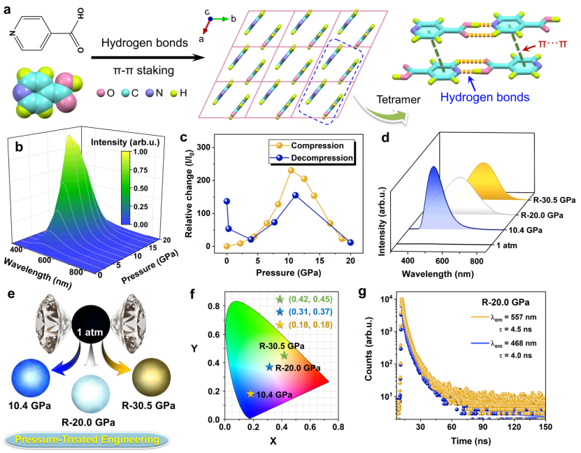 高压与超硬材料全国重点实验室/综合极端条件高压科学中心杨新一教授课题组在有机分子的多色发光研究方面取得重要进展。提出利用压强工程调控初始不发光的异烟酸(INA)材料中分子间双电荷转移强度,实现从暗态到高质量多色发射(即蓝光、白光、黄光)的可控切换。相关研究成果以“Controllable multicolor emission from initially non-emissive organic molecules by pressure engineering”为题发表在《自然通讯》(Nat. Commun. 2025, 16, 8780)上。
