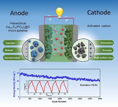 能量与功率密度是设计新型储能装置必须考虑的两大因素。在摇椅式电池中,电极材料可通过发生氧化还原反应提供较高的可逆比容量,进而得到高能量密度;而在电容器中,电极材料在表面发生快速的离子吸/脱附反应,从而实现高功率密度。为了同时获得高能量和高功率密度,杜菲教授课题组2016级硕士研究生张中禹巧妙地将嵌入脱出型CaTi2(PO4)3@C负极与吸脱附型活性炭正极组装成新型杂化离子电容器, 获得了80 Wh/Kg和5144 W/Kg的能量与功率密度,是当前钾离子电池研究的佼佼者。同时,张中禹还利用原位X射线衍射技术揭示了CaTi2(PO4)3@C在可逆储钾过程中由两相反应向固溶体反应的相变机制。该项研究成果发表在Advanced Functional Materials(DOI: 10.1002/adfm.201802684)。