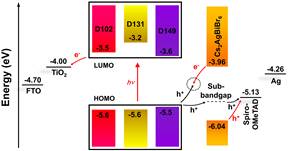 在课题组之前的工作中,已经证实了使用叶绿素敏化的二氧化钛作为电子传输层能够提高Cs2AgBiBr6双钙钛矿太阳能电池的光吸收能力,进而提高电池的光电转化效率 (JACS 143, 2207-2211, 2021)。为了进一步提高电池的光电转化效率,降低原材料的获取难度,以及更加深入地对电池界面间的电荷传输过程进行研究,课题组选取了3种商业化的吲哚染料,并基于其制备了相应的染料/双钙钛矿异质结太阳能电池。得益于吲哚染料对电池光电流的贡献,Cs2AgBiBr6双钙钛矿太阳能电池的光电转化效率首次被提升至4.23%。经过研究发现,电池光电性能的提升,除了得益于在染料和双钙钛矿之间存在的Z型电荷传输方式,还包括Cs2AgBiBr6具有传输空穴的能力,使得染料中激发的空穴能够通过Cs2AgBiBr6的子带隙传输到spiro-OMeTAD,提高了电池内部的电荷传输效率。该工作将染料敏化太阳能电池和钙钛矿太阳能电池进行了有机结合,并对其工作机理进行了深入探究,为该类型光伏器件的开发以及进一步的拓展研究铺平了道路,具有重要的科学意义。