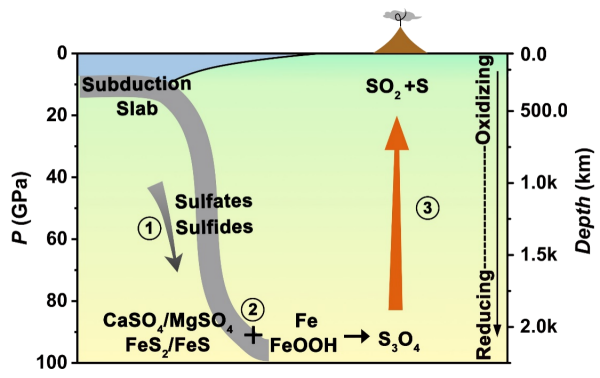 马琰铭教授研究团队利用CALYPSO晶体结构预测方法,在高压条件下(>79 GPa),预言了一种新型硫-氧化合物—S3O4。该化合物具有层状结构的特征,包含S(+II)和S(+IV)两种混合价态(图1(a))。同时,在高压高温下计算了S3O4相对于SO2和S的稳定性,发现S3O4在深地幔温压条件下具有稳定性,但在地球浅层温压条件下会分解形成SO2和S (图1(b))。进一步计算发现,在深地幔高压条件下,部分含硫矿物(如硫酸盐和硫化物)可以发生氧化还原反应生成S3O4,据此提出了硫在地球内部可能的循环过程(图2):① 含硫化合物(如硫酸盐和硫化物)通过板块俯冲,被输送到深地幔;② 含硫化合物与铁或针铁矿发生氧化还原反应生成S3O4;③ S3O4通过地质活动(如地幔柱等)输运到地球浅层,发生分解生成S和SO2。研究工作为破解火山喷发过程中的“硫过量”谜团和理解地球内部硫循环提供了新的思路。
