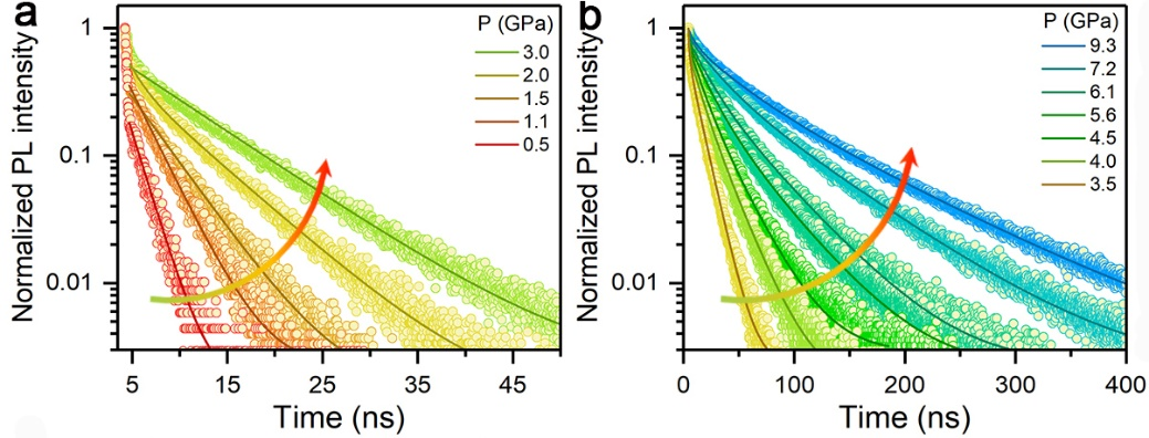 的邹勃教授、王凯教授,鼎新学者张龙博士,北京大学的蒋鸿研究员和大连化学物理研究所的隋来志博士合作,以二维层状材料PEA4AgBiBr8 (PEA+ = C6H5CH2CH2NH3+)作为模型体系,从载流子动力学和局域晶格畸变的激发态行为的角度揭示了压力诱导发射的基本物理化学机制。