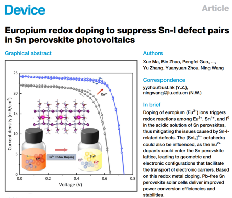 凝聚态物理系王宁教授团队在无铅钙钛矿太阳电池研究方面取得新进展,相关成果以“Europium Redox Doping to Suppress Sn-I Defect Pairs in Sn Perovskite Photovoltaics”为题,发表在国际知名学术期刊《Device》上。