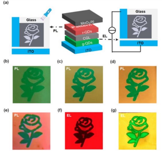 (a)建议的防伪显示器的简化结构图(中)和光响应示意图(左)和电响应示意图(右)。在365 nm光刺激下,不同rqd厚度的双防伪器件的光响应照片。r-量子点层的厚度为(b) ~20 nm,(c) ~25 nm,(d) ~30 nm,(e) ~60 nm。在(f) 8 V,(g) 13 V电压下驱动下,具有~60nmr量子点层的防伪器件的电响应照片。