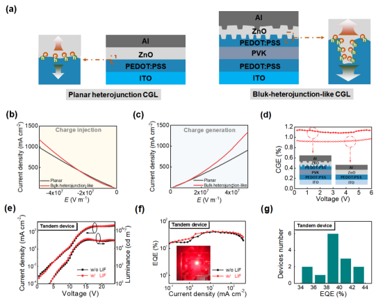Figure. (a)平面和体异质结的电荷产生示意图。由于PEDOT: PSS和氧化锌之间的更广泛的有效界面,从界面到发射单元发生漏斗状电荷流。平面和体异质结CGL器件的电流密度电场强度(JE)特性在(b)电荷注入模式和(c)电荷产生模式下的结构。(d)有和不有微结构界面的CGLs的充电生成效率。(e)含和不含氟化锂层的串联QLEDs的电流密度发光-电压(JLV)和(f)外部量子效率-电流密度(EQE J)特性。(g)含lif的串联qled的峰EQE直方图。