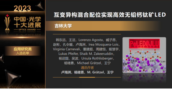 王宁教授团队发表在Nature上的论文“Tautomeric mixture coordination enables efficient lead-free perovskite LEDs” [Nature, 622,493-498 (2023)]入选“2023年中国光学十大进展(应用研究类)。该研究由王宁团队联合东南大学卢海洲、上海大学杨绪勇、洛桑联邦理工学院Michael Grätzel等人首次提出一种适用于稳定无铅锡基钙钛矿的普适性策略:通过互变异构体混合与钙钛矿配位,诱导Sn2+周围电子局域化,并自发的在钙钛矿表面形成准垂直、稳定的氢键互变异构二聚体和三聚体超结构,避免安德森局域导致的不利影响,有效提高钙钛矿晶体结构的有序性。制备的锡基钙钛矿LED峰值外量子效率达20.29%。该成果有望推动无铅钙钛矿LED领域的发展。