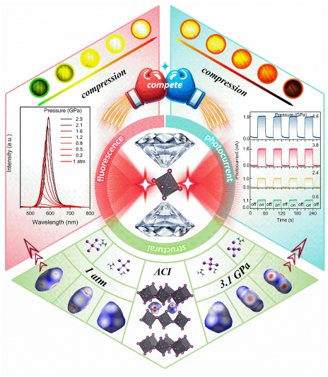 该工作以ACI型杂化钙钛矿(ACA)(MA)PbI4为研究对象,利用金刚石对顶砧压力产生装置施加压力,在加压过程中,实现了激子发射的大幅度提升,并且在2.5GPa压力区间观察到由绿到红的大范围压致变色连续可调范围。研究表明:压力改变Pb-I-Pb键角,导致Pb的6p与I的5p电子轨道耦合减弱,降低电子连通性,致使更多电子通过辐射复合途径跃迁至基态。