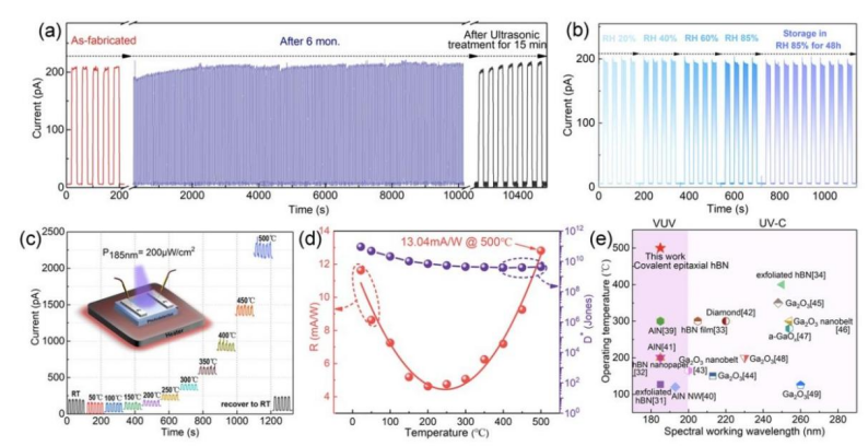 此外,借助共价异质外延h-BN的稳健性的显著优点,探测器在经历6个月长时间储存、10000秒长期辐照、高湿、高温的极端环境下表现出了稳定且持续响应的高稳健性特点。器件在500℃下表现出超越室温下的光响应值(13.04mA/W),所能承受的使用温度显著高于已知报道的宽禁带半导体基高温光电探测器,展示了基于共价异质外延h-BN的传感器和电子设备在实时和极端恶劣环境条件下稳定工作的潜力。这项工作为大面积、高质量、厚度可控的h-BN薄膜提供了新型生长策略,在高集成结构设计、高稳健器件性能等方面的优势,有望推动电子、光电器件、探测器、极端条件器件应用等技术领域的突破。