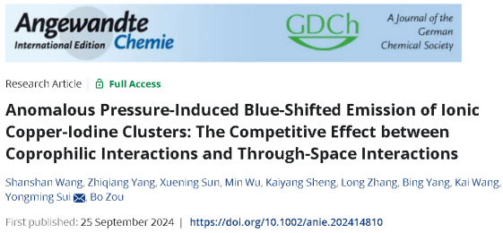 超硬材料国家重点实验室邹勃教授团队隋永明课题组利用压强调制亲铜和空间相互作用,实现了离子型铜碘簇奇异的压致蓝移发光行为。相关研究成果以“Anomalous Pressure-Induced Blue-Shifted Emission of Ionic Copper-Iodine Clusters: The Competitive Effect between Coprophilic Interactions and Through-Space Interactions”为题发表于《Angewandte Chemie International Edition》。