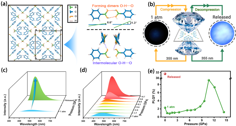 具有缺电子基团和芳香环的有机分子由于p-π*共轭效应可以促进分子内电荷转移,为开发高效发光材料提供广阔的应用平台。然而,在形成聚集体时,吸电子能力使芳香环的π电子密度降低,从而降低了芳香环间的静电斥力。这将导致π-π相互作用增强,降低荧光量子产率。高压作为独立于温度和化学组分的热力学参量,可以有效地缩短原子间距离、改变材料的晶体结构,进而使材料产生优异的光学性质。基于此,杨新一课题组提出利用压强处理策略调控分子堆积方式,实现初始弱荧光有机材料的高效蓝光发射。