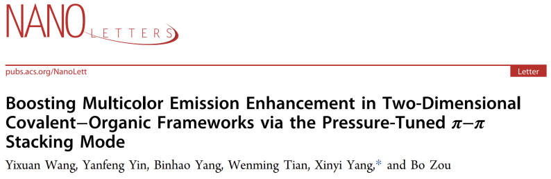 高压与超硬材料全国重点实验室/综合极端条件高压科学中心邹勃教授团队杨新一课题组利用高压调控π−π堆叠构型实现二维共价有机框架(COFs)材料的多色发射增强。相关研究成果以“Boosting Multicolor Emission Enhancement in Two-Dimensional Covalent−Organic Frameworks via the Pressure-Tuned π−π Stacking Mode”为题发表在国际学术期刊《Nano Letters》上。