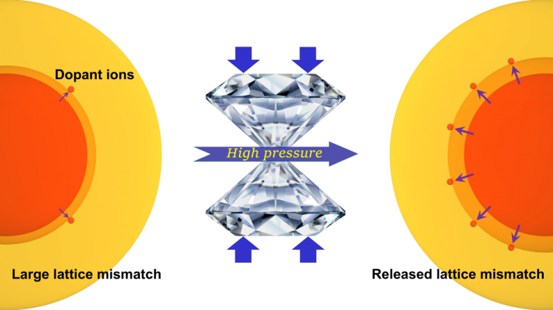 高压与超硬材料全国重点实验室的肖冠军教授在锰(Ⅱ)离子(Mn2+) d-d跃迁发光的高压调控研究中取得了重要进展。通过设计具有较高内部应力的MnS@CdS核壳结构,实现了Mn2+离子发光在更高压强条件下的反常蓝移转变,为更全面、深入理解Mn2+离子发光的背后物理机制提供了新见解。相关研究成果以“Abnormal Blueshift of Mn d–d Emission Unlocked by Decreasing Phonon Coupling under High Pressure”为题发表在《Angewandte Chemie International Edition》上。