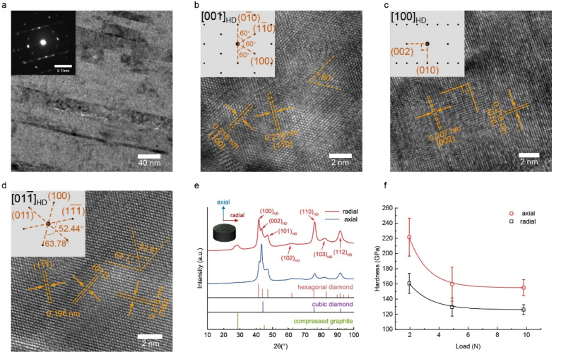 图3. 高取向六方金刚石块材的透射电镜照片、XRD以及维氏硬度测试
