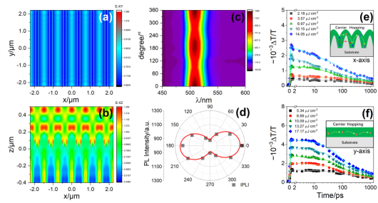 该研究团队选择DVD光盘作为基底—其表面具有天然的周期性沟槽结构(周期约740 nm,深度约为158nm),在该结构上制备的CsPbBr3量子点薄膜具备了周期性结构,并基于此薄膜制备了偏振特性的光电探测器。量子点薄膜与微纳结构的结合,实现了“材料特性”与“光学设计”的协同优化,为新型光电器件设计提供了范式。将该探测器与数字微镜器(DMD)结合,实现了单像素-成像系统,具备偏振度差异的成像功能。通过有限时域差分法(FDTD)模拟和偏振光致发光测试,他们发现DVD的周期性介电场可以与其中的光子耦合,导致微纳结构的CsPbBr3量子点薄膜中光生载流子的复合行为具有偏振光学特性。偏振瞬态吸收光谱试证实了CsPbBr3量子点薄膜中光生载流子在周期性的微纳结构中的运动具有各向异性。本文首次从周期性介电场与各向异性的载流子运动入手,揭示了二者的协同效应导致了基于周期性微结构光电器件具有偏振特性的工作机制,为基于量子点材料的偏振单像素成像系统的设计与优化提供了全新思路。