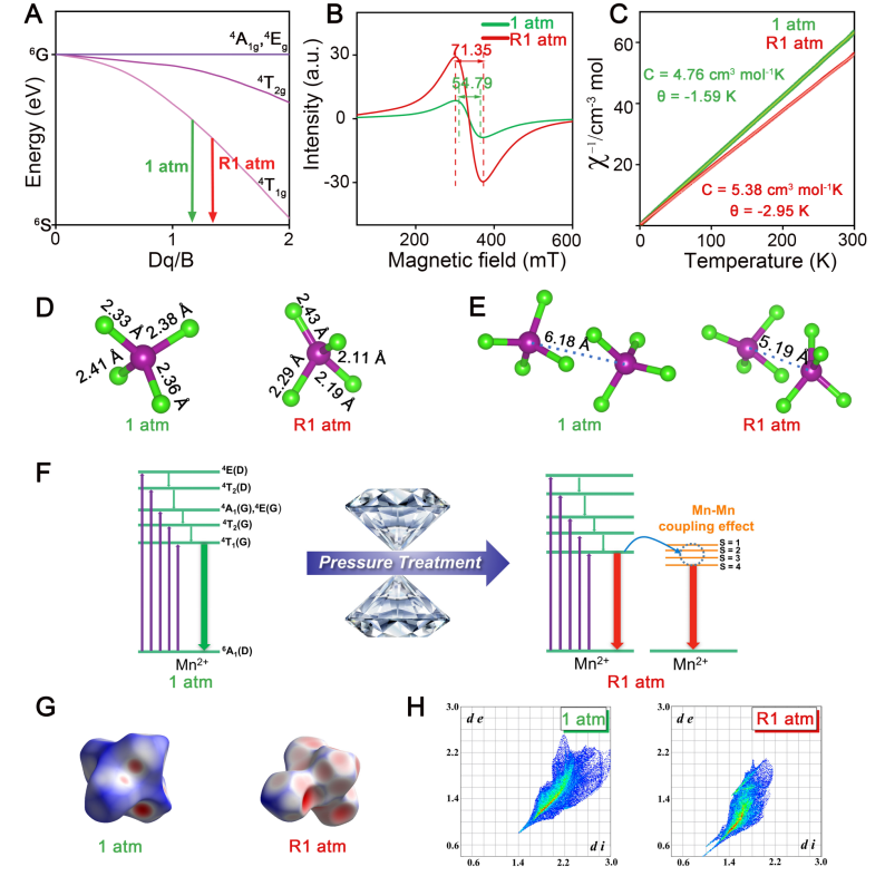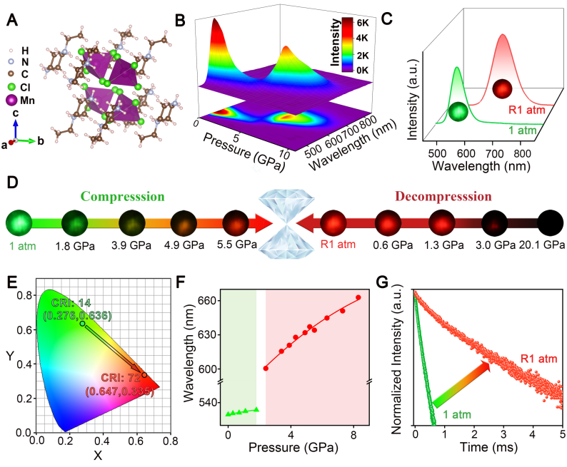 白光发射二极管 WLED) 因其多场景应用而成为重要的新一代固态光源之一。然而,由于缺乏具有高显色指数 (CRI) 的红光发射组分,WLED 通常会发出刺眼的白光。开发一种在蓝光区域具有强吸收能力并在红光区域有效发射的红光发光材料是一项挑战。压强可以通过改变材料的晶体结构和电子构型,进而有效调控材料的物理和化学性质。尽管一些基相关的金属卤化物在高压下实现红色发射的研究已有报道,但是其红色发射在压力完全释放后消失,这在很大程度上抑制了这种材料的实际应用。因此,探索经压力处理后仍能保持高效红光发射性能的锰基金属卤化物具有重要的研究意义与应用价值。