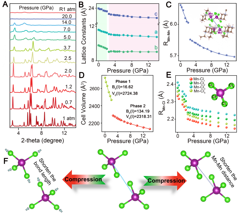 2. 高压下(C6H14N2)MnCl4的结构变化及局域结构中Mn-Mn 距离和 Mn-Cl 键长减小的示意图。