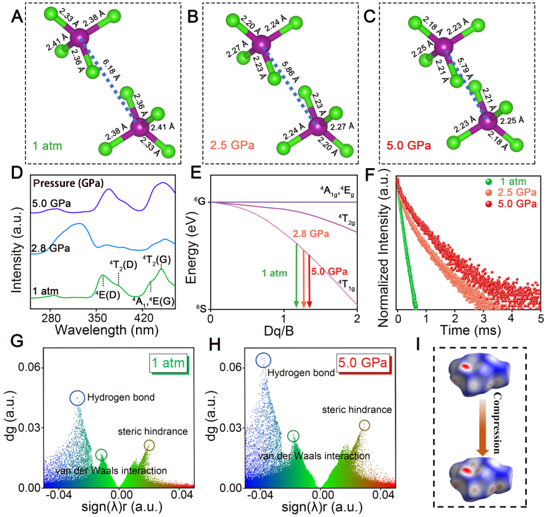 3. 不同压力下(C6H14N2)MnCl4的结构示意图、激发光谱、Tanabe-Sugan (T-S) 图、时间寿命衰减曲线、IGM等值面分析和 Hirshfeld 表面分析。