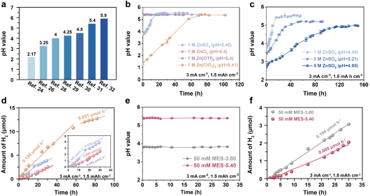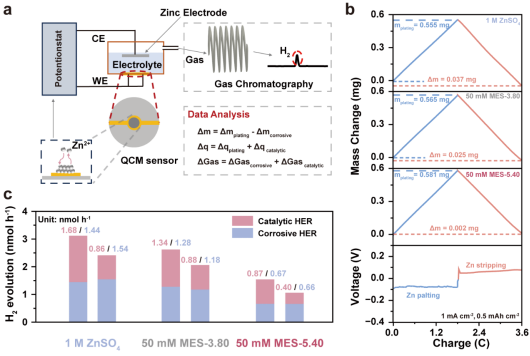 近年来,水系金属电池(AMBs)凭借着环境友好,成本低廉,安全性高等优势,已成为下一代规模化储能的有力候选者。然而,在金属负极表面严重的析氢反应(HER)对其实际应用构成了重大挑战。研究表明,保持稳定的pH值可有效抑制副产物形成,提升电化学性能。然而目前的研究仅经验性地提出使用两性化合物/弱酸弱碱盐来稳定电解液的pH值,缺乏对于最优pH值的探讨和确定,使得调控效果因电池而异,无法推广至其他体系,不具普适性;同时无法精确区分腐蚀产氢和催化产氢,对析氢反应的原理缺乏进一步探究。因此,阐明pH调控对析氢反应抑制的根本原理,定量解耦腐蚀产氢和催化产氢的贡献,对于建立合理的pH调控原则和制定有效的析氢抑制策略至关重要。