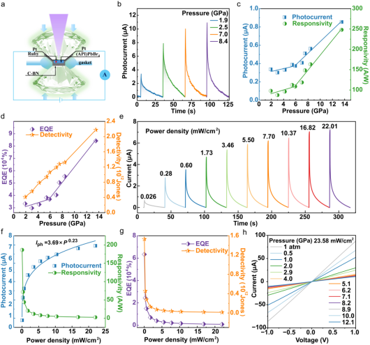 在本研究中,李顺心课题组提出了一种基于二维层状钙钛矿(API)PbBr4的高压稳健型光电探测器,研究了(API)PbBr4在13.5 GPa压力下的结构演化和光电性能调控。结果表明,该材料表现出压力驱动的光电探测器性能增强,包括于13.5 GPa压力下高达248.0 A W⁻¹的响应度,比探测率超过2.2 × 10¹² Jones,以及高达8.4 × 10⁴%的外量子效率。与其在1.9 GPa初始压力下的性能相比,光电流、响应度和外量子效率均增加了2.5倍以上,比探测率提高了5倍以上。这些发现不仅揭示了二维层状钙钛矿在高压条件下的结构-性能耦合机理,而且为设计能够在极端环境下工作的高性能紫外光电探测器提供了理论基础和实用策略。