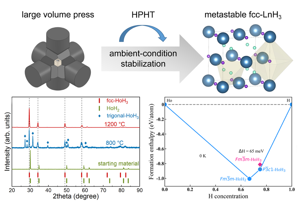 氢化物在高压条件下往往会出现新的结构相与物性,但不少高压相在卸压过程中会回变为常压稳定相,甚至发生分解,从而限制了其在常压环境下的系统表征与进一步研究。针对这一难点,研究团队以稀土二氢化物(LnH2)为前驱体,采用氨硼烷作为可控固体氢源,在大腔体压机(LVP)高温高压条件下实现受控氢化,并通过优化压力-温度-时间(P-T-t)路径,将原本仅在高压下出现的亚稳面心立方(fcc)LnH3 相截获并保留至室温常压。