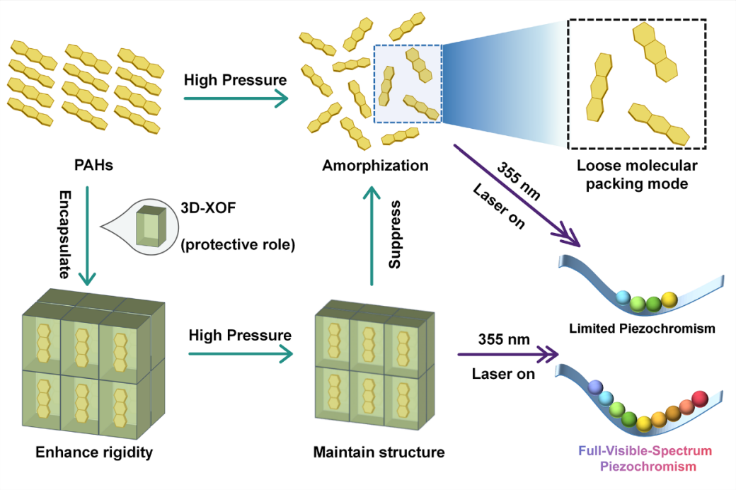 全可见光谱压致变色对于先进防伪与信息存储应用至关重要,但实现这一目标仍然面临巨大挑战。在压致变色材料中,多环芳烃(PAHs)由于具有固有的π–π堆积结构被视为一类极具潜力的材料。尽管如此,压强诱导的无序结构通常会引发能量耗散,导致其高压下的光致发光淬灭,严重限制其压致变色性能。因此,如何在单一材料中实现荧光波长移动超过190 nm的全可见光谱压致变色一直是该领域的研究重点。此前,杨新一教授课题组利用压强处理工程成功实现MOFs材料的单色荧光增强(Angew. Chem. Int. Ed. 2022, 61, e202210836)、压强诱导MOFs材料蓝色/多色发光并截获(Adv. Mater. 2023, 35, 2211729; Adv. Mater. 2024, 36, 2403281)、压强诱导有机分子材料多色发光并截获(Nat. Commun. 2025, 16, 8780)、压强诱导MOFs材料多色可调荧光/磷光发射并截获(Nat. Commun. 2025, 16, 696; Nat. Commun. 2025, 16, 4166)、压强处理工程实现有机分子材料荧光/磷光混合型白光发射(Nat. Commun. 2024, 15, 7778)。基于前期对有机及框架材料光物理过程的有效调控,杨新一教授课题组提出,利用刚性框架的主-客体策略解决PAHs固有的压强诱导结构无序难题的新思路。通过维持高压下主体框架材料的刚性,可有效保护客体分子免受无序结构的影响,提升材料在高压下的稳定性与发光性能。