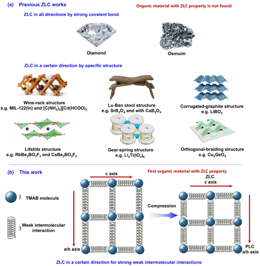 零线性压缩材料可用作抗冲击材料,在高达数十吉帕的高压冲击环境中保持稳定。发现具有零线性压缩特性的含能材料,并阐明其构效关系,将极大地满足含能材料日益增长的高稳定性、高安全性需求。然而,目前仅发现包含超硬材料、特殊骨架材料两类共十余种具有零压缩行为的材料,含能有机材料的零压缩行为研究仍属空白。针对这一问题,肖冠军教授及合作者以富氢化合物TMAB为研究对象,结合高压同步辐射X射线衍射、高压单晶衍射、拉曼、红外、吸收光谱以及第一性原理计算,系统地研究了TMAB的高压结构演变,证明了TMAB在9.2 GPa发生了等结构相变,确定了在9.2至14.0 GPa压力范围内TMAB的零线性压缩行为,填补了有机材料零压缩研究的空白,并提出双氢键协同作用是TMAB零压缩行为的关键。本研究发现了具有零线性压缩行为的富氢有机分子晶体材料,建立了双氢键与富氢材料结构演化行为之间的联系,为抗冲击推进剂的设计提供了新思路。