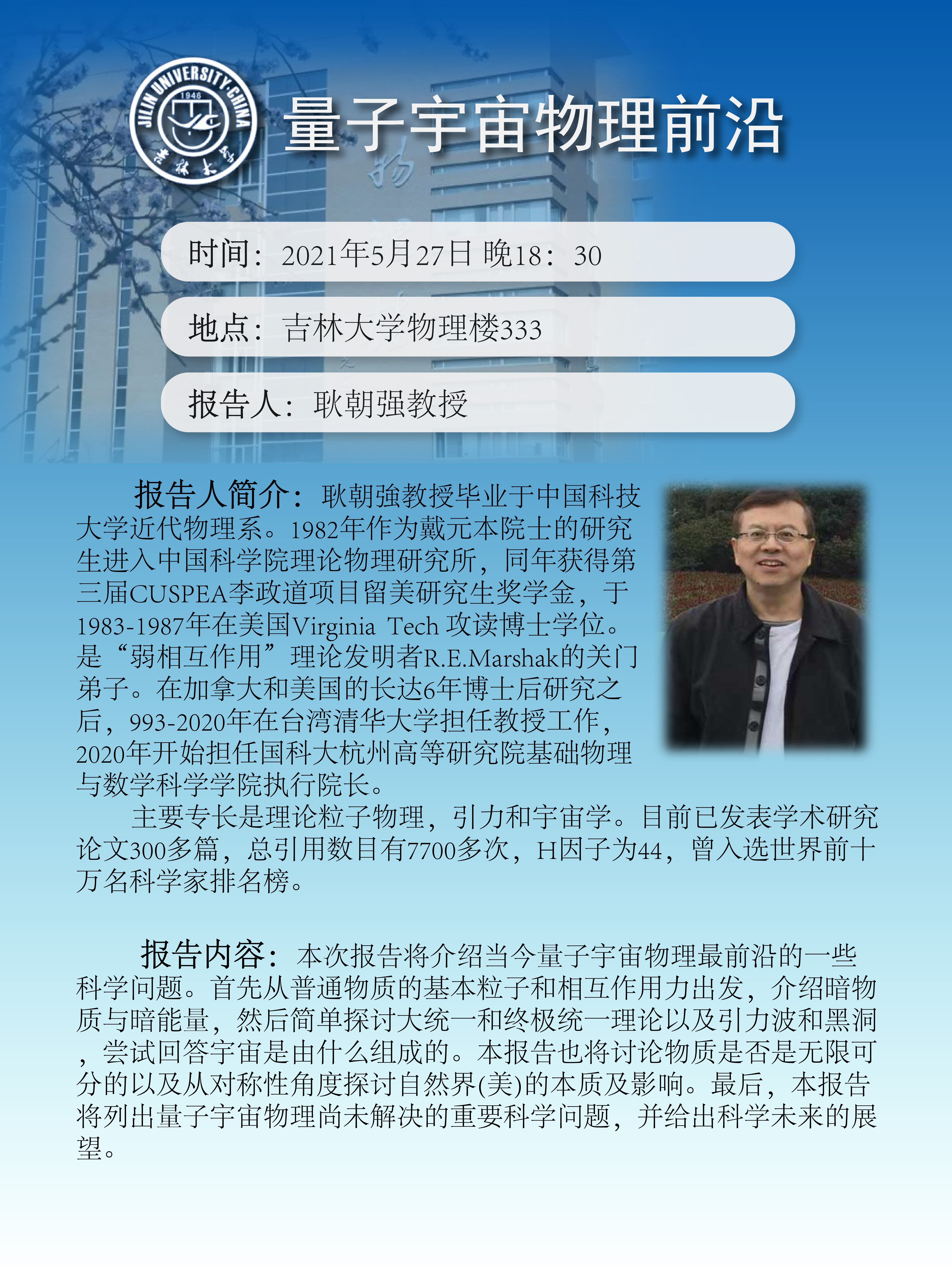 耿朝強教授大学毕业于中国科技大学近代物理系(1978-1982)。1982年进入中国科学院理论物理研究所作为的研戴元本院士究生,同年获得第三届CUSPEA李政道项目留美研究生奖学金,于1983-1987年在美国Virginia Tech 攻读博士学位。是自然界四大相互作用力之一“弱相互作用”的理论发明者R.E.Marshak(前美国物理学会会长)的关门弟子。在加拿大和美国的长达6年博士后研究之后,1993-2020年在台湾清华大学担任教授工作, 2020年开始担任国科大杭州高等研究院基础物理与数学科学学院执行院长。耿朝強教授的主要专长是理论粒子物理,引力和宇宙学。他目前已经发表学术研究论文300多篇,总引用数目有7700多次,H因子为44,曾入选世界前十万名科学家排名榜