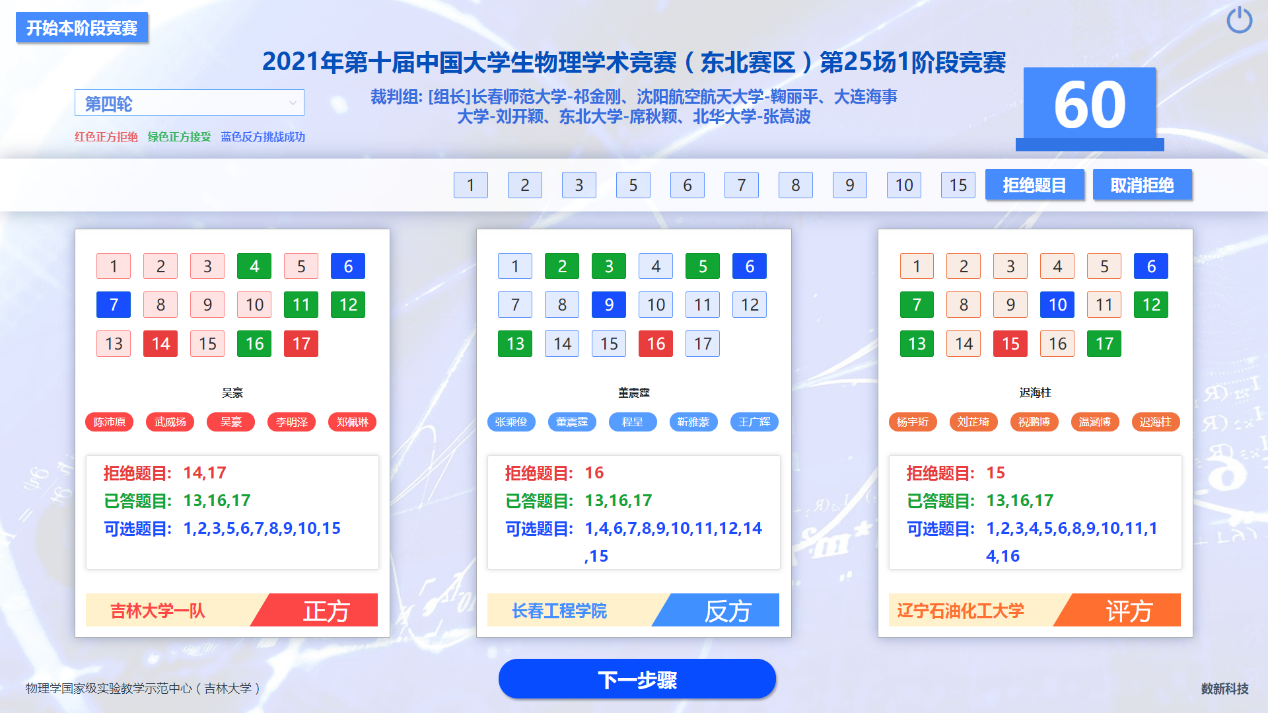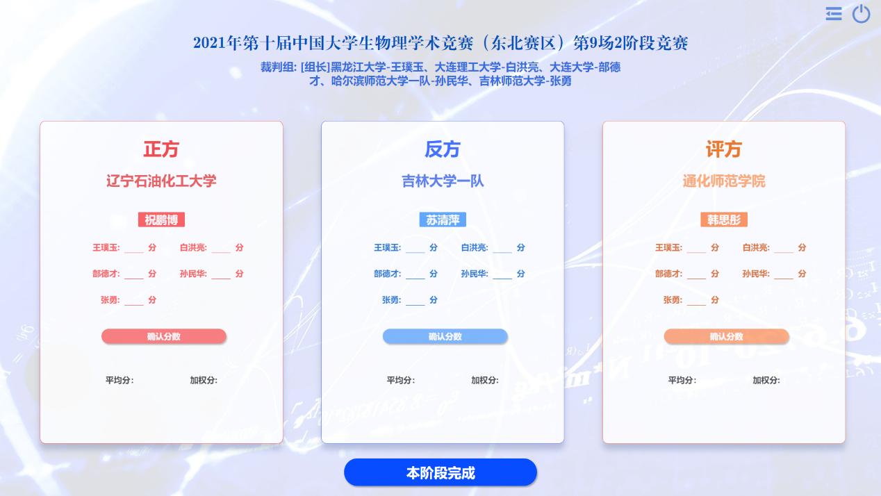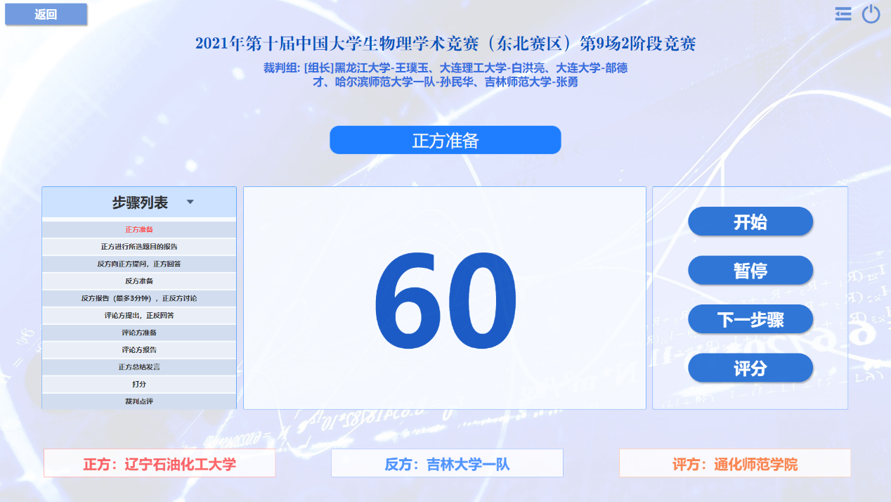 在为期两天的线上比赛中,共有来自东三省22所高校的24支代表队参赛。各参赛队综合物理理论、数学建模、实验设计及科学思辨等多项手段,针对17个公开题目(引自国际青年物理学家锦标赛IYPT)展开了近一年的研究探索,并以正、反方团队辩论的形式进行比赛。赛事分四轮,共有128名参赛选手和96场竞赛。为此,我院专门开发了一套竞赛系统,保障了赛事信息及时的统计、更新和发布,受到了各参赛队伍的好评。最后,经过激烈的角逐,av网站