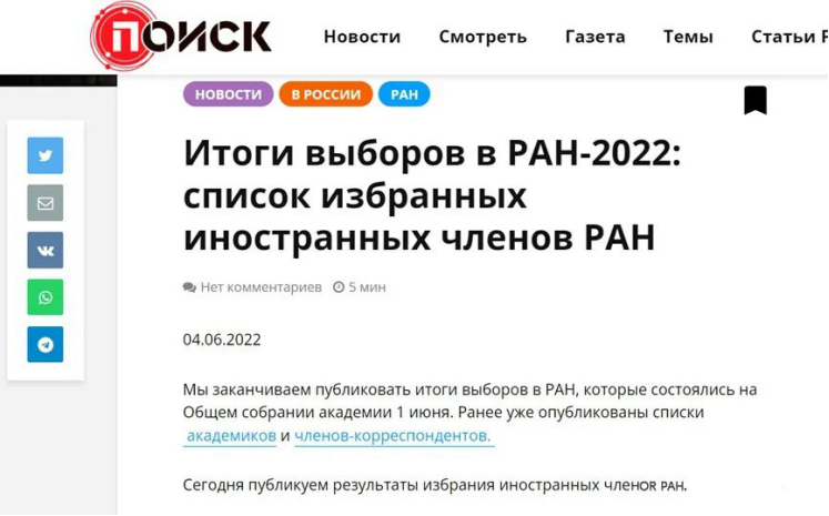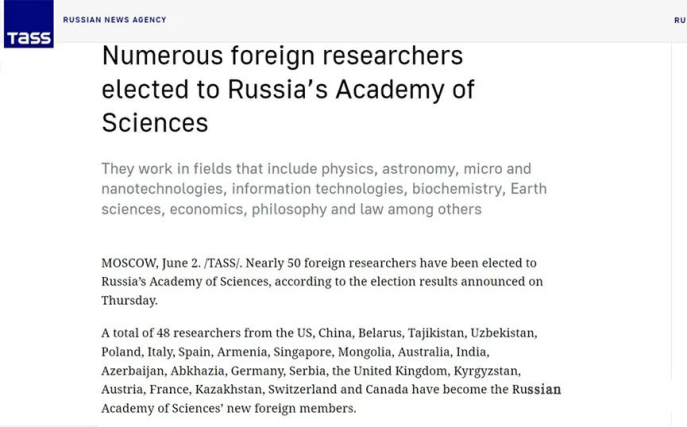 2022年6月2日,俄罗斯科学院(Russian Academy of Sciences,RAS)官方公布,新增外籍院士48位,以表彰他们在科学领域的杰出贡献。av网站