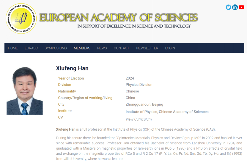 近日,欧洲科学院(EAS或EURASC)公布新增院士名单,其中吉大物理1993届博士毕业校友韩秀峰研究员成功入选。热烈祝贺韩老师!