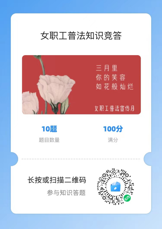 本次普法知识竞答活动,将普法与男女平等基本国策相结合、与保护女职工合法权益的相关法律法规相结合,向女职工们弘扬法治精神,普及法律知识,增强女职工依法维权意识,题目主要涵盖《中华人民共和国妇女权益保障法》、《女职工劳动保护特别规定》等法律法规政策。