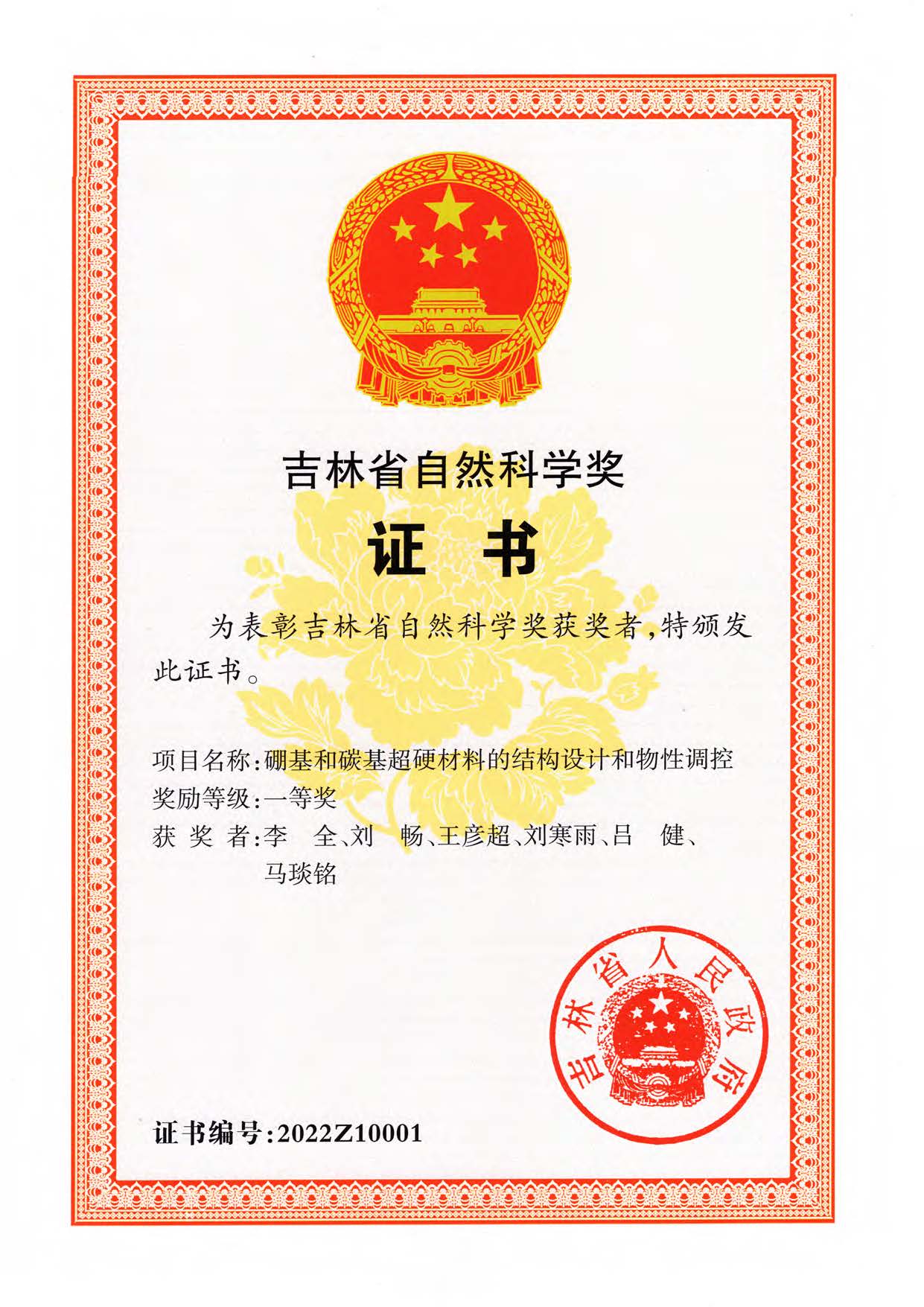 2022年12月9日,吉林省人民政府发布了《关于2022年度吉林省科学技术奖励的决定》。由我院马琰铭教授研究团队完成的“硼基和碳基超硬材料的结构设计和物性调控”项目荣获吉林省自然科学奖一等奖(主要完成人:李全,刘畅,王彦超,刘寒雨,吕健,马琰铭)。