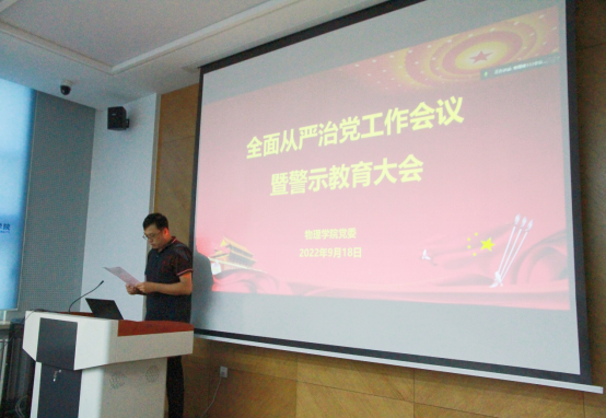 最后,党委副书记、纪委书记唐宗明按照学校纪委和学院党委的工作要求,通报了警示案件,传达了相关文件精神,要求广大教师对警示案件中反映出的问题保持高度警醒,要深刻认识自己肩负的责任和使命,以案为鉴,吸取教训,将纪律、规矩转化为日常习惯,遵纪守法,时刻锤炼教育报国之志,坚守为党育人、为国育才的初心,营造风清气正的校园环境,以优良的师德与学风教风,推动学院建设。