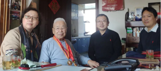 孟文卓(左一)、邹勃(右一)到家中看望姚玉洁教授(右二)