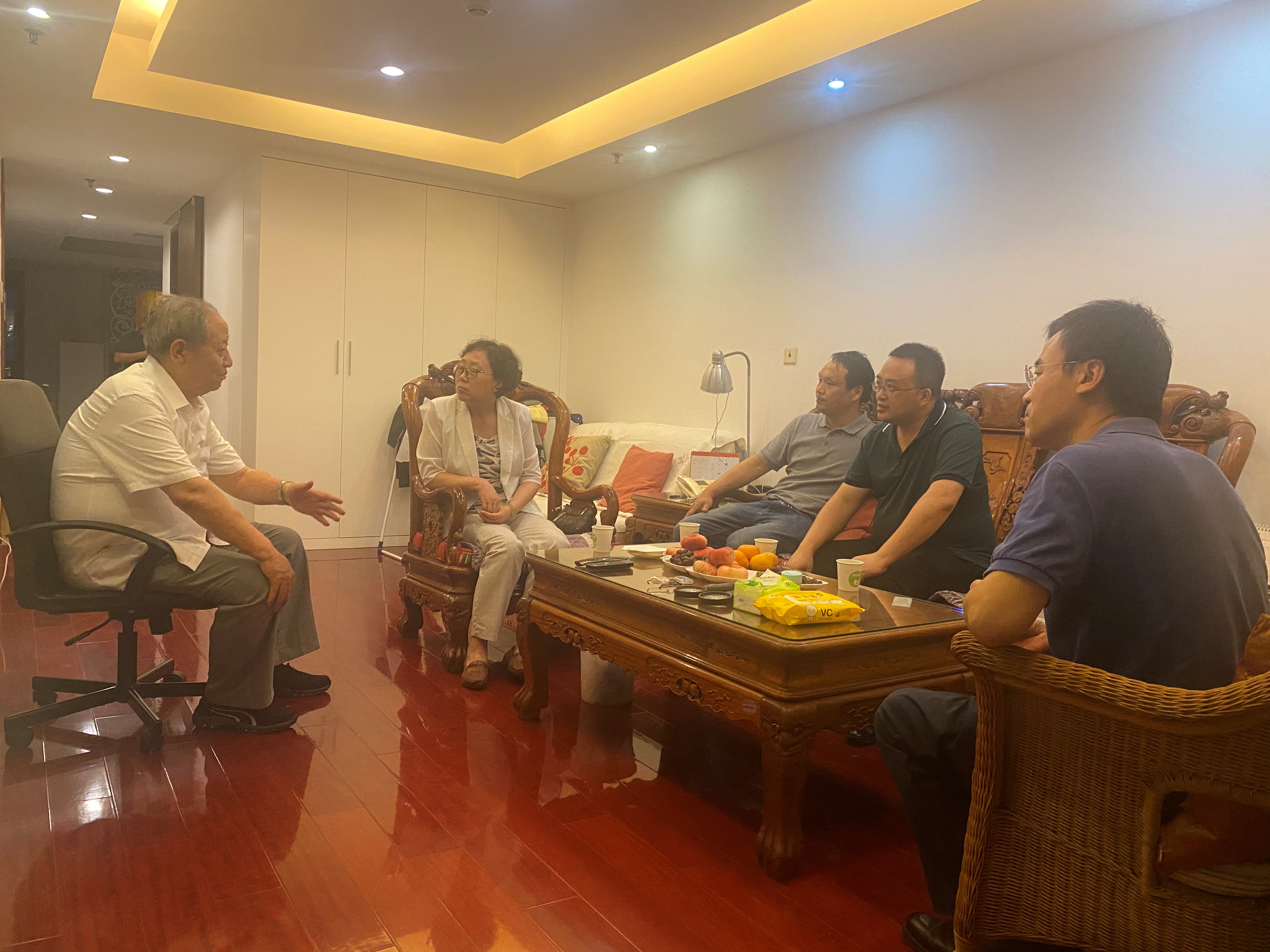 在宋家树院士家里,前排为宋家树、王佩璇夫妇,后排左起为李兆辉(93级)、姚伟(87级)、孟文卓、杨景