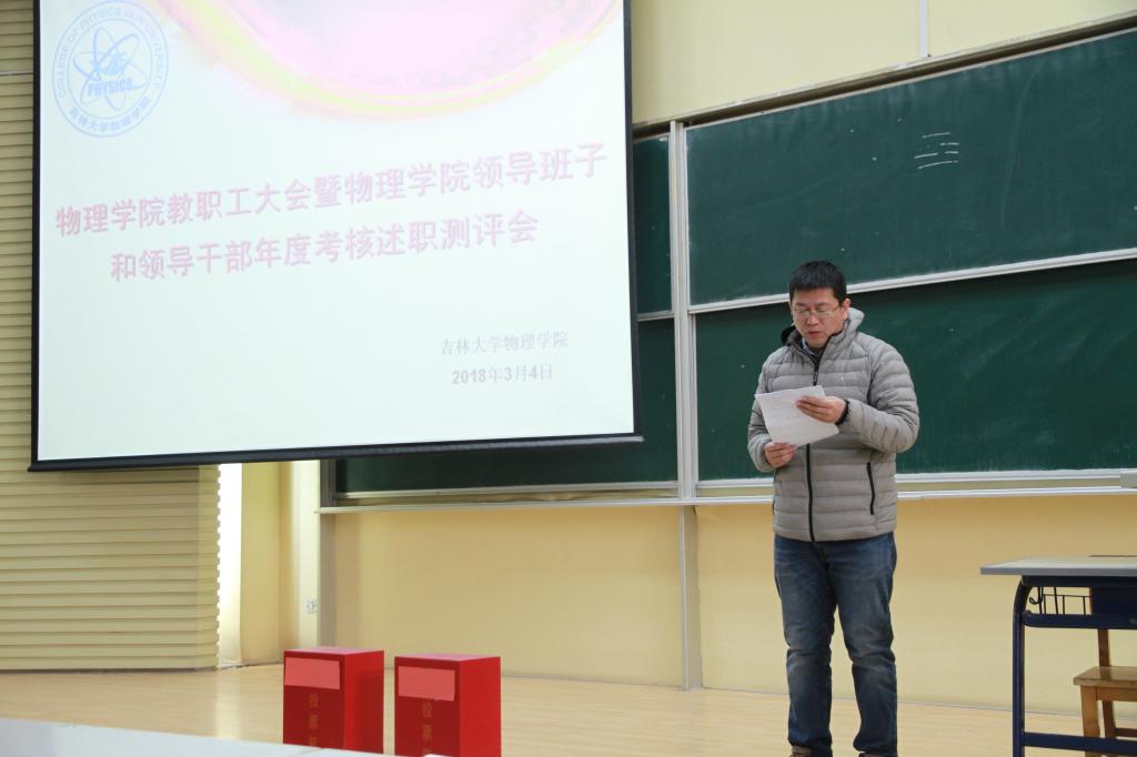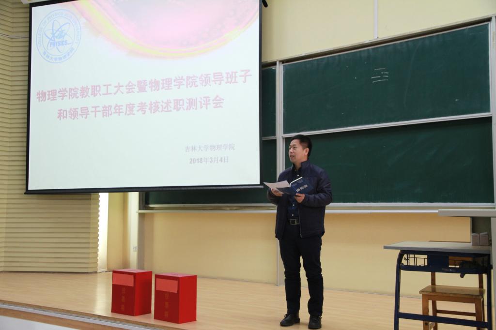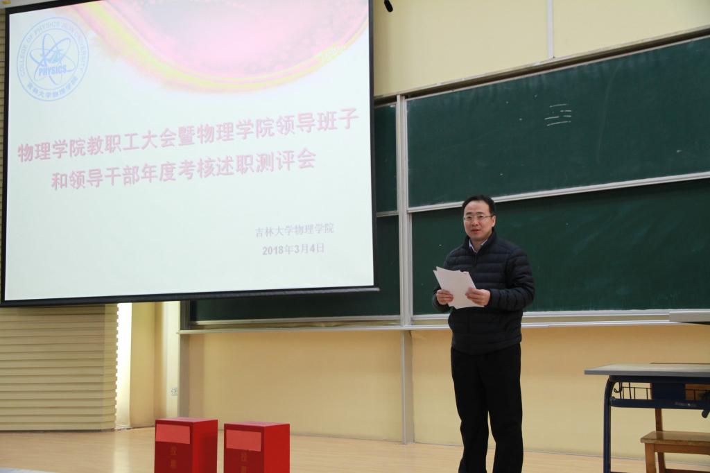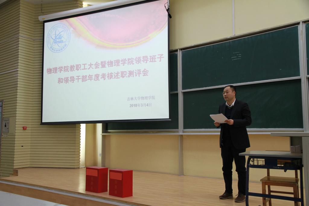 首先,马琰铭院长代表党政领导班子作工作总结,他围绕“学院坚持党的领导,以思想和觉悟提升为工作核心”、“学院坚持集体领导,民主集中的科学决策机制”、“学院以一流学科建设为主线,全面统筹推进各项工作”,从学科建设、师资队伍、人才培养、科学研究、国际交流等方面总结了学院2017年度工作。马院长指出在总结取得成绩的同时,全院教职工也要正确认识到学院在发展过程中面临的良好机遇和巨大挑战。马琰铭院长代表学院班子感谢全体教职工在过去的一年里所付出的辛勤努力,希望全院师生继续支持学院的整体工作,携手奋进,共同推动av网站