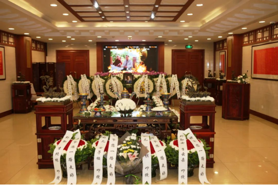 告别仪式大厅庄严肃穆,巨幅挽联“一生光明磊落对人对事清白无瑕,终生求知好学务真务实心底无私”垂立两侧,是宋先生一生的写照;横幅挽联“沉痛悼念宋家树同志”表达了对宋先生的深深敬意和无限追思。宋家树先生身盖鲜红党旗,安卧于鲜花翠柏之中。