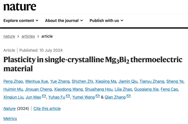 物质模拟方法与软件教育部重点实验室付钰豪副教授与哈尔滨工业大学深圳校区毛俊教授和张倩教授、中国科学院物理研究所王玉梅副研究员等人合作,在塑性半导体功能材料方面取得了重大突破,首次发现层状结构的Mg3Bi2单晶室温下兼具有优异塑性和高热电性能,面内拉伸应变接近100%、热电优值zT~0.65,理论与实验结合,揭示了塑性变形的微观机制。这一重大研究成果以“Plasticity in single-crystalline Mg3Bi2 thermoelectric material”为题,于2024年7月10日发表在Nature上。