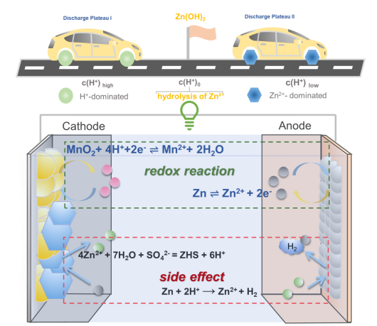 本文基于Zn||MnO2的电池系统,并通过分离变量巧妙地调节了电池内各部分的成分变化。排除了Zn2+/H+嵌入的可能性,并有力地证明了溶解/沉积机制的主导地位。这项研究指出,有争议的双放电平台的化学反应皆为溶解反应,分别由质子和锌离子主导。放电平台I是由电解质中过剩的H+主导的MnO2溶解,而放电平台II则是当质子浓度降低到产生Zn(OH)2时,Zn2+水解释放质子而产生的平稳放电平台。这项工作使人们更好地理解了Zn||MnO2的溶解/沉积机制,为锰基水系电池的实际应用铺平了道路,也为研究电化学反应机理提供了一种全新的实验方法。
