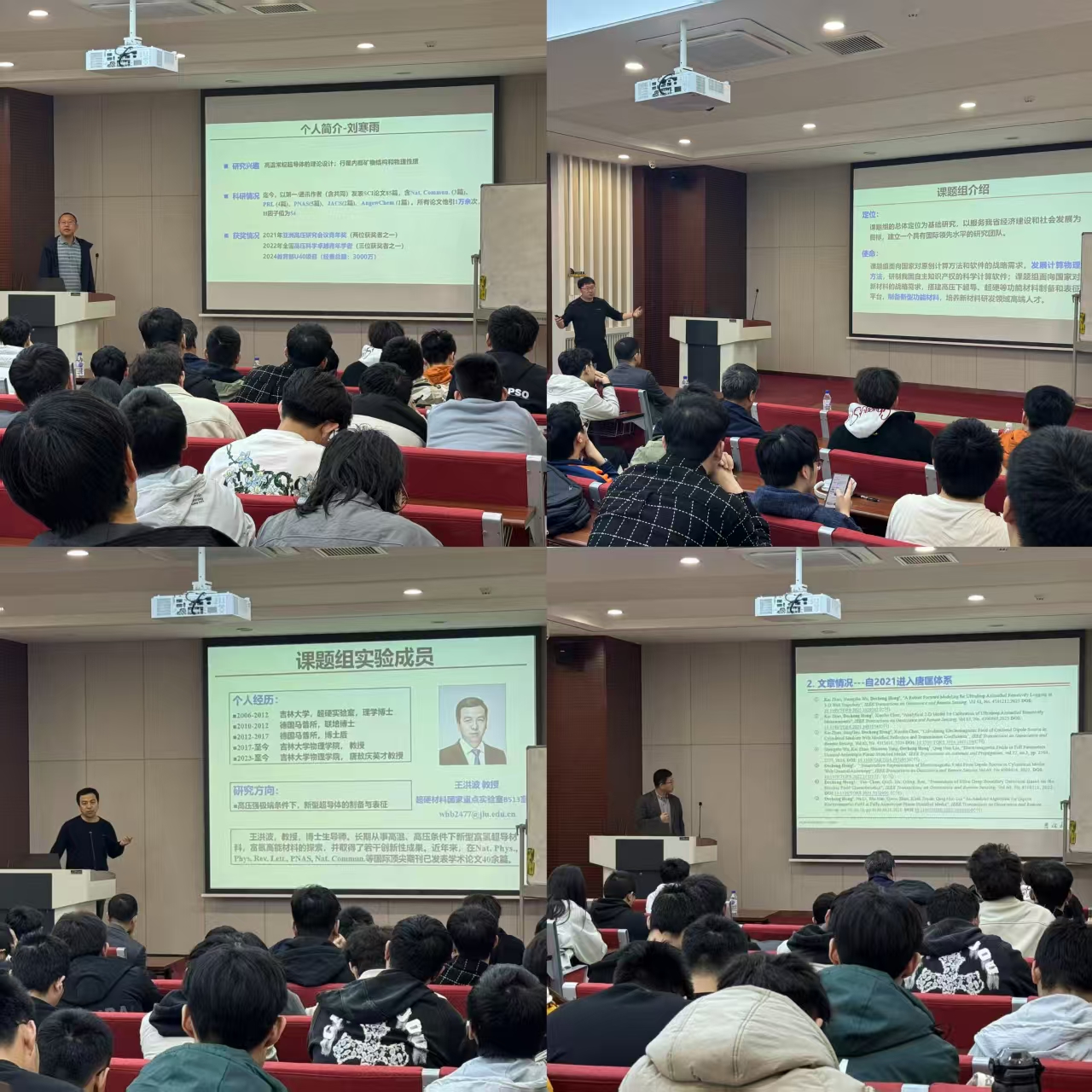 五位专家分别就各自研究领域作专题报告。刘寒雨教授介绍了超导研究前沿与实验室招生政策;谢禹教授阐述了物质模拟的理论与实践;王洪波教授展示了高压材料合成技术的最新成果;洪德成教授讲解了电磁感应测井、传播电阻率测井、介电测井和井间电磁技术;李鑫副教授讲解了大腔体压机的研究与应用。五位专家的报告内容翔实、深入浅出,既有理论高度又具实践指导意义。