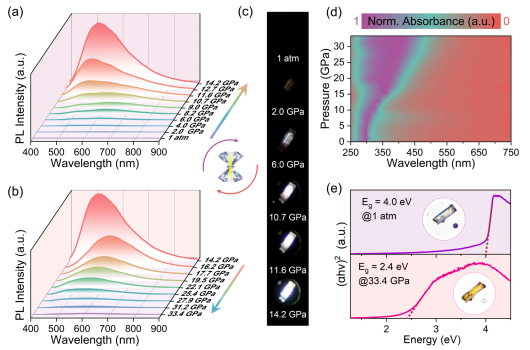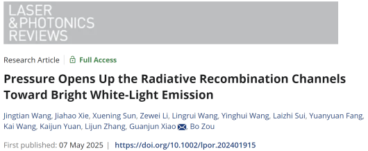 近日,av网站 高压与超硬材料全国重点实验室邹勃教授团队肖冠军教授等人在全无机非铅金属卤化物的压强诱导发光研究中取得重要进展,通过高压打开了辐射跃迁通道,实现了一维金属卤化物Cs2AgI3“无光”到“有光”的反常压强诱导PIE行为(Pressure-Induced Emission, PIE),产生了高压下的高品质明亮白光发射,并深入揭示了背后的物理机制,推动了压力传感、压力开关和高压极端条件下的特种照明与显示应用。相关研究成果以“Pressure Opens Up the Radiative Recombination Channels Toward Bright White-Light Emission”为题发表在《Laser & Photonics Reviews》上。