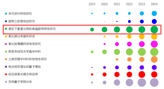 报告指出,该前沿在物理学十大热点中位列第三,共涵盖35篇核心论文,总被引频次达到5508次,核心论文平均出版年为2022.0,表明该研究方向近年来持续产出高影响力成果。富氢化合物作为潜在的高温超导材料体系,在高压强条件下表现出优异的超导临界温度,为探索常压下高温超导提供了重要途径。其长期受到关注,不仅源于基础物理研究的科学价值,更因为其对未来能源、电子信息等领域的潜在革命性影响。