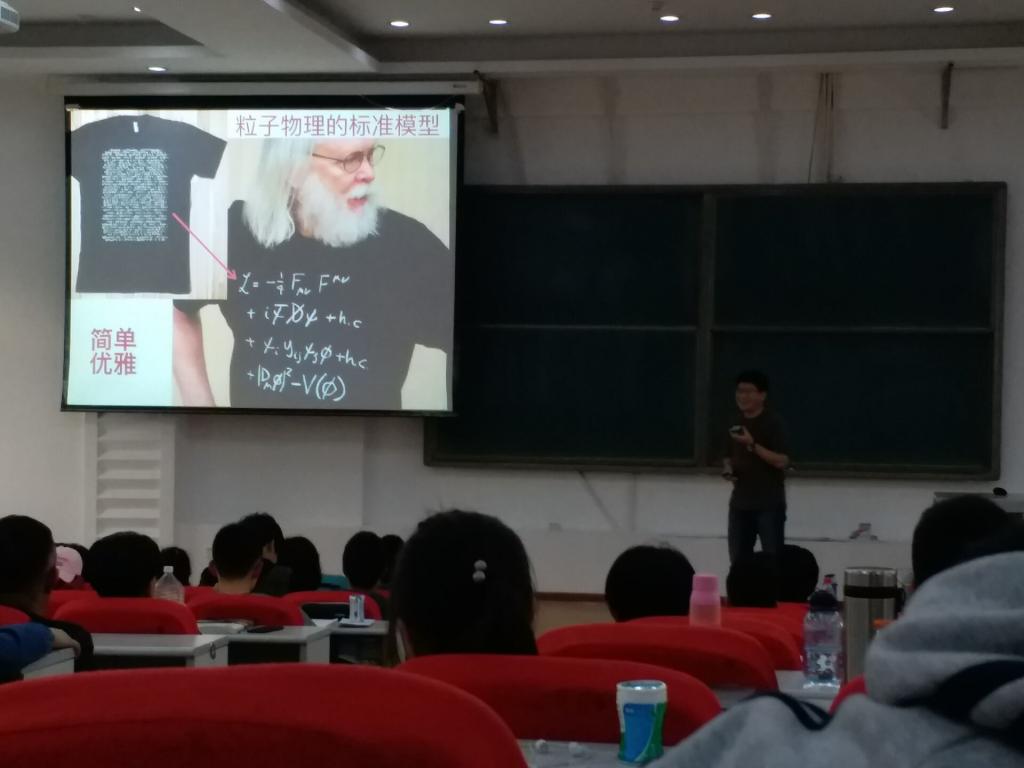 报告之初,曹庆宏教授为大学生介绍了一个新的领域——粒子物理。在粒子物理的阐述中,不仅有更深层次,更高能量的粒子间相互作用的探测,还有简单优雅的粒子物理标准模型的演示。更不可思议的是,粒子物理以微观世界语言即自热单位制的方式,将质量、长度、时间、温度及能量建立起联系,让我们深刻感受到理论物理的魅力所在。