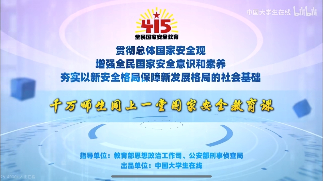 今年4月15日,是第8个全民国家安全教育日,为加强国家安全宣传教育,不断涵养研究生国家安全意识,创建“平安和谐”校园,按照学院党委统一部署,2023年4月14日,研究生办公室组织全体研究生收看“千万师生同上一堂国家安全教育课”主题公开课。