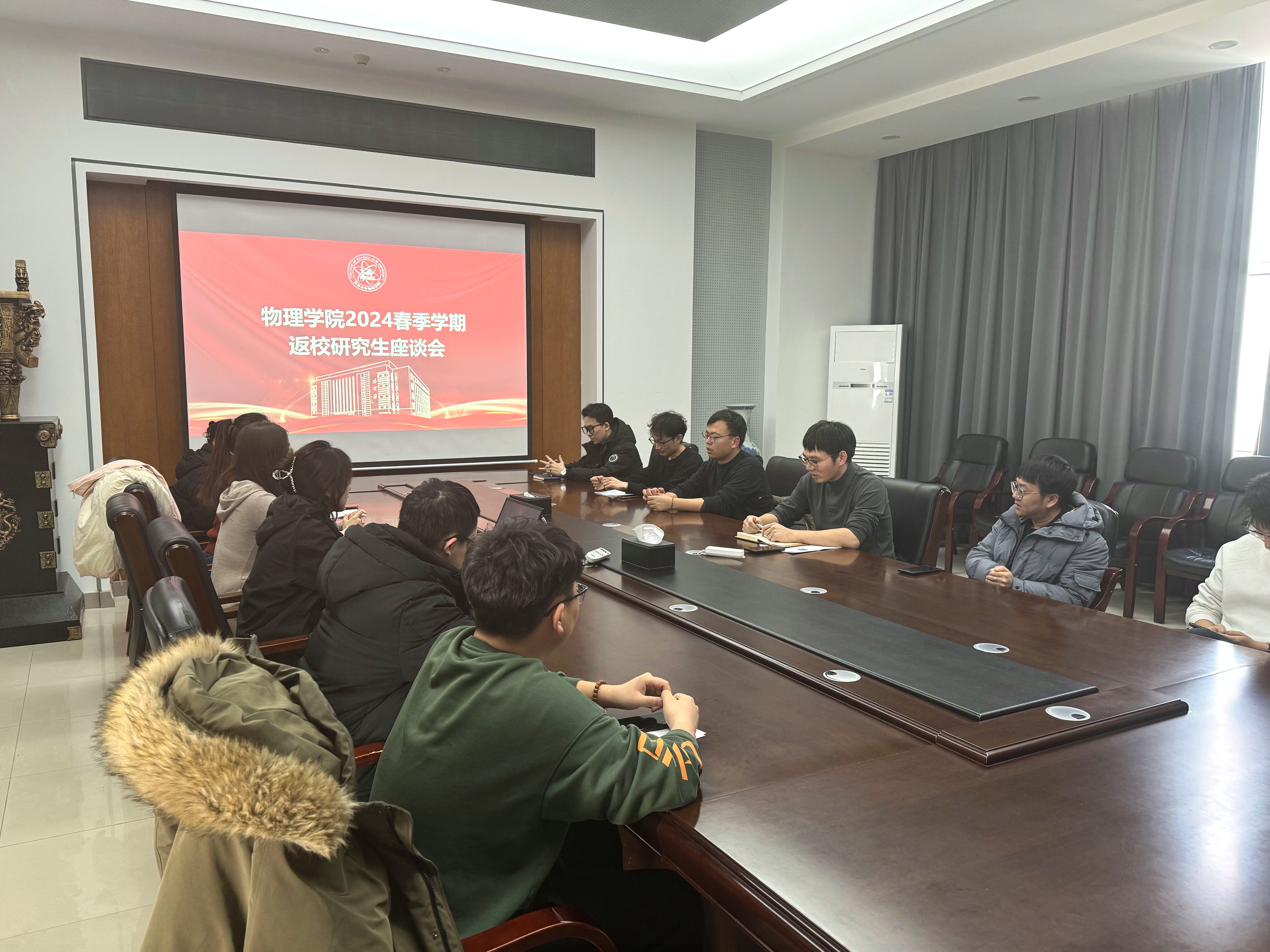 在物理楼301会议室召开2024年春季学期返校研究生座谈会。各年级博士、硕士研究生代表12人参加,会议由研究生辅导员曹鹏主持。