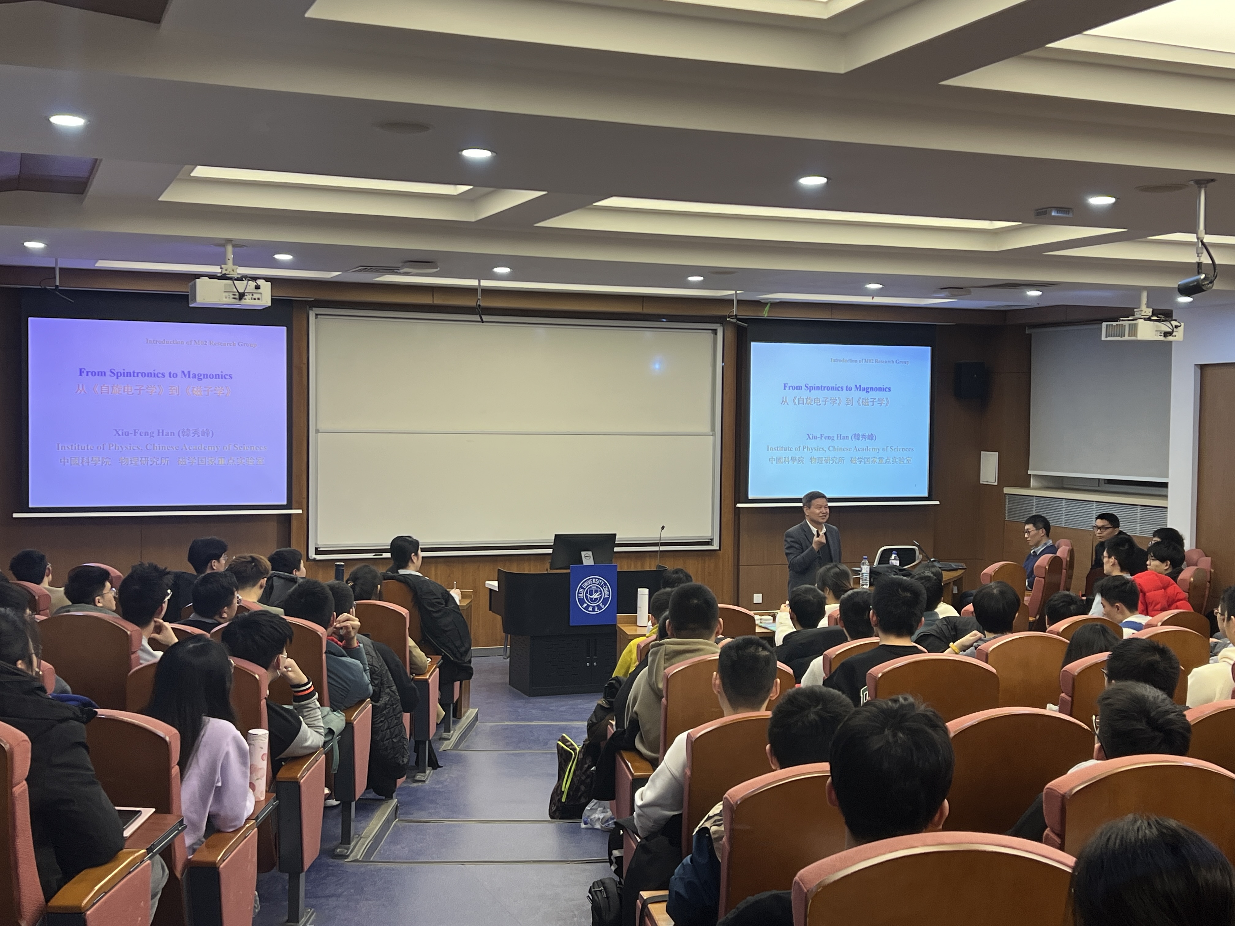 党委副书记兼副院长杨讴菡,本科生辅导员刘扬、车禹剑、赵一安出席活动。会场内座无虚席,同学们对宣讲会翘首以盼。首先杨讴菡书记为讲座进行了开场介绍,之后鲁年鹏特聘研究员、韩秀峰研究员先后进行了学术报告,分别介绍了各自领域内的主要进展、前沿问题和各自课题组的主要成果,回答了同学们踊跃的提问,并同同学们对双方关心的学术问题进行深入的交流探讨,会场内气氛热情澎湃。物理所的老师们还准备了物理所的研究生招生宣传册,向到场的同学们分发,针对av网站